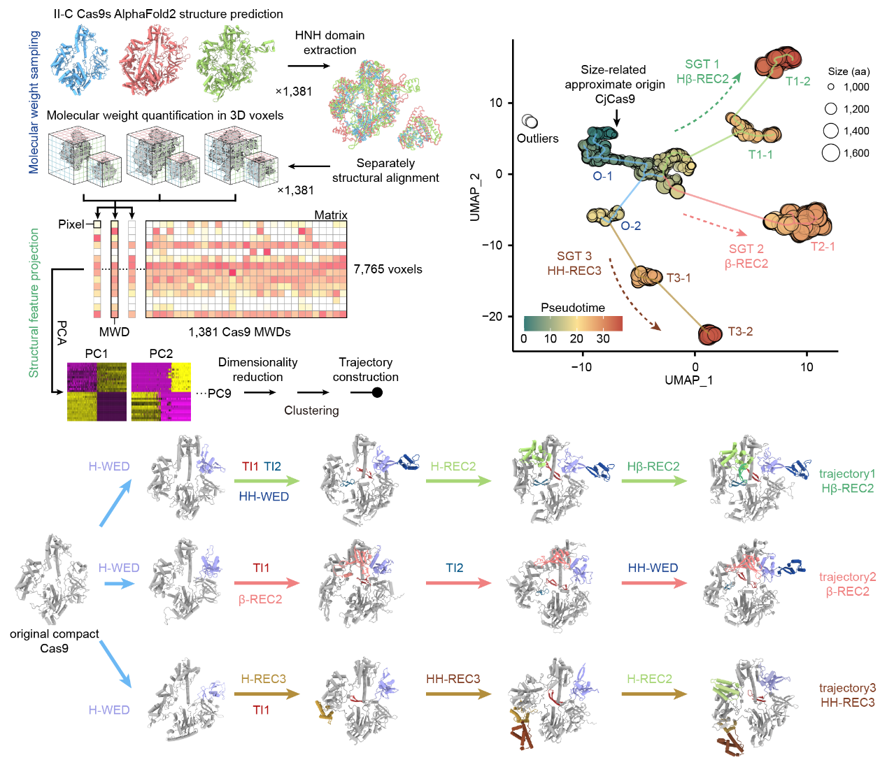 By utilizing bioinformatics analysis, the researchers identified novel-associated genes (NAGs) enriched in the gene clusters of larger II-C type Cas9 proteins, suggesting their involvement in bacterial immunity mediated by Cas9. To further explore this relationship, the team developed a structural growth trajectory analysis (SGT analysis), which enabled them to predict and analyze the structures of 1,381 II-C type Cas9 proteins. They discovered that larger II-C Cas9 proteins show a trend of evolving through new functional domains acquirements, with NAGs enriched at the endpoints of these growth trajectories.