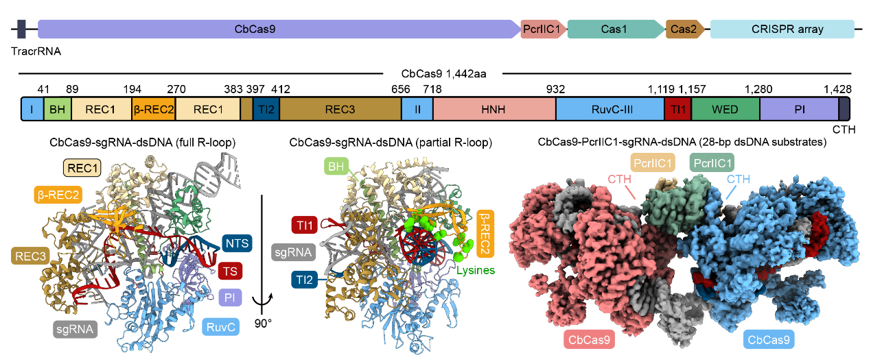CbCas9 locus (top), CbCas9 effector protein structure (bottom left), and CbCas9-PcrIIC1 complex structure (bottom right)