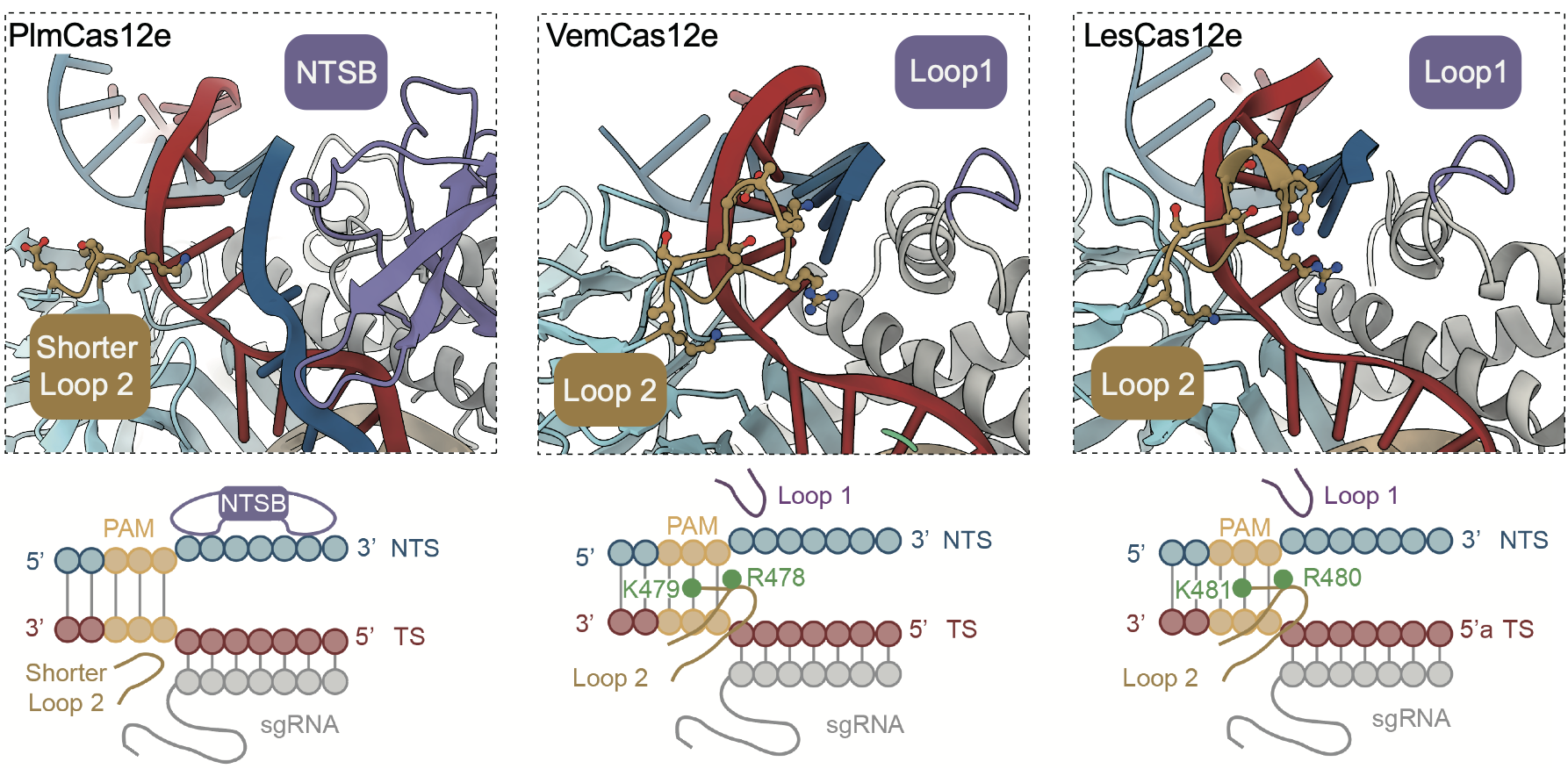 Furthermore, the research team employed single-particle cryo-electron microscopy (cryo-EM) to resolve and analyze the structures of VemCas12e and LesCas12e ternary complexes. The analysis revealed that these orthologs’ different R-loop formation abilities under high salt conditions are attributed to specific structural elements responsible for DNA unwinding (Figure 2). Some Cas12e orthologs, such as PlmCas12e and DpbCas12e, contain a unique NTSB domain that promotes DNA unwinding and enhances cleavage activity under high salt conditions. In contrast, Cas12e orthologs lacking the NTSB domain, like VemCas12e and LesCas12e, rely on positively charged loops (such as Loop 1 and Loop 2) to unwind DNA but with less pronounced effects on R-loop formation and lower cleavage efficiency. Consistent with this, the NTSB domain in Plm2Cas12e lacks key residues involved in interactions with the non-target and target strands (NTS and TS), resulting in lower dsDNA cleavage activity under high salt concentrations. On the other hand, the OpbCas12e protein features a helix-loop structure in its RuvC nuclease domain that promotes R-loop formation, thus maintaining relatively higher dsDNA cleavage activity under high salt conditions (Figure 1). These structural differences underscore the biochemical diversity within the Cas12e family.