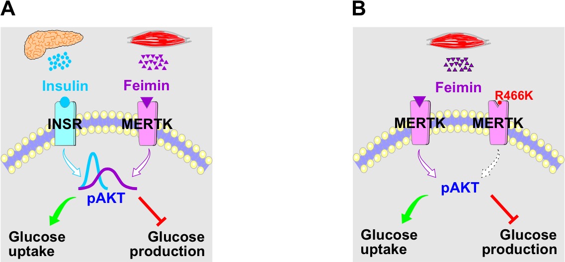 Clinical genetic analyses further revealed that individuals with the MERTK (R466K) mutation exhibited elevated postprandial blood glucose levels. In vitro experiments demonstrated that the R466K mutation reduced Feimin’s receptor binding capacity and weakened AKT activation, providing a mechanistic explanation for hyperglycemia in mutation carriers (Figure 1B).