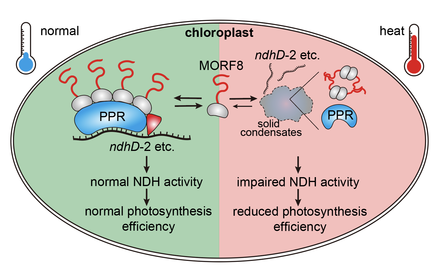 Titled “Solid-like condensation of MORF8 inhibits RNA editing under heat stress in Arabidopsis,” the research demonstrates that MORF8 undergoes phase separation under high temperatures, recruiting key RNA editing factors, including pentatricopeptide repeat (PPR) proteins, into condensates. This sequestration weakens PPR proteins’ ability to bind target RNAs, reducing editing efficiency at critical sites such as ndhD-2. Consequently, the activity of photosynthetic membrane complexes (e.g., NDH-PSI) declines, leading to reduced photosynthetic efficiency (Figure 1).