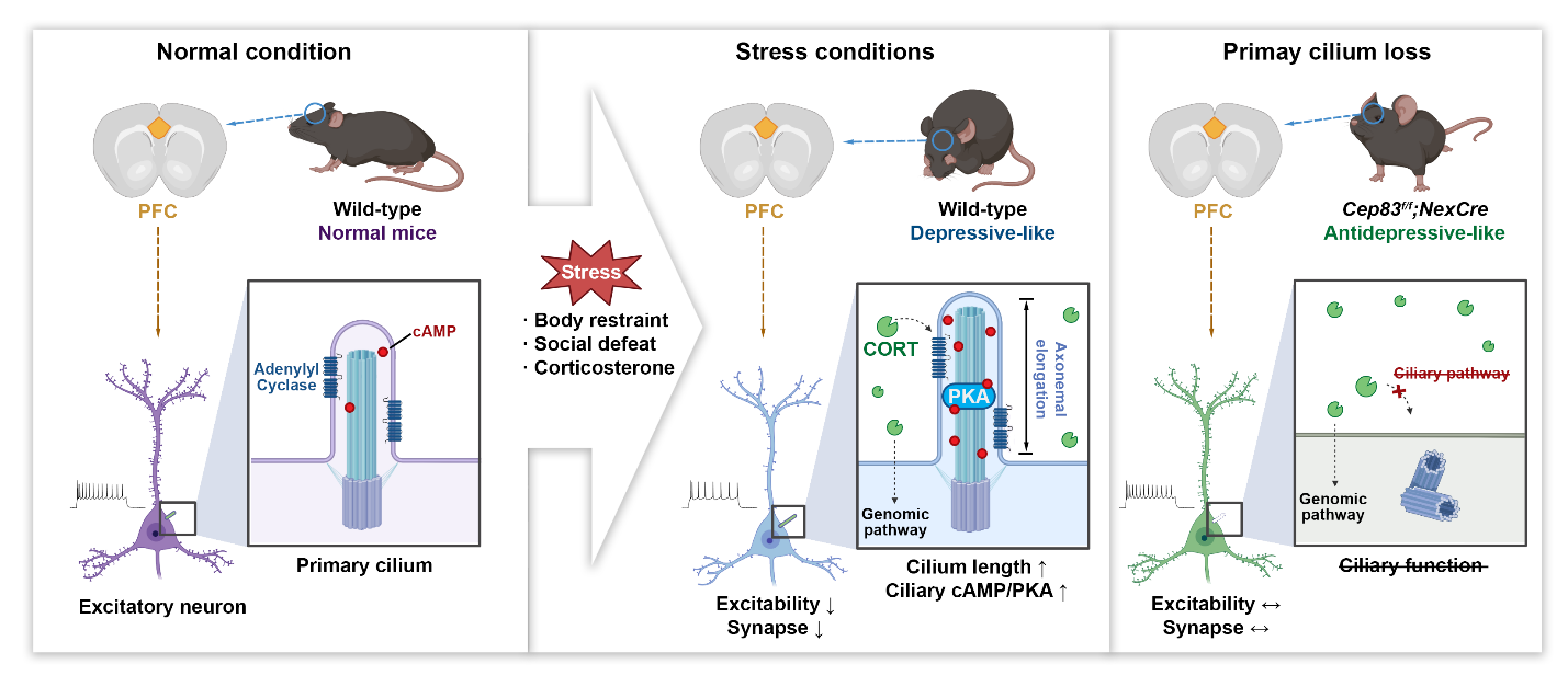 On March 7, 2025, a study titled “Primary ciliary protein kinase A activity in the prefrontal cortex modulates stress in mice” was published online in Neuron by the group of Prof. Song-Hai Shi at Tsinghua University. This study, for the first time, reveals a crucial role of the primary cilia of prefrontal cortical excitatory neurons in modulating animal stress (Figure 1).