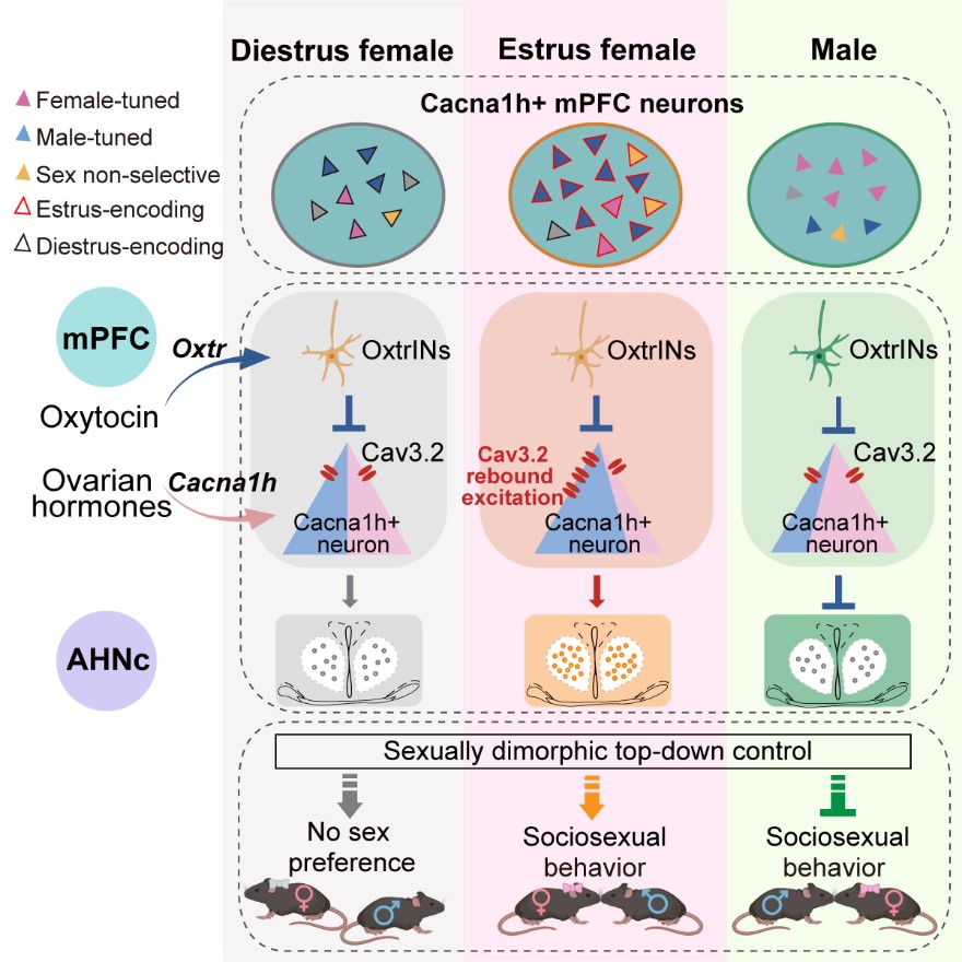 Using single-cell RNA sequencing, circuit tracing, and electrophysiology, the team identified a subtype of deep-layer pyramidal neurons in the mPFC that are especially sensitive to hormonal changes across the female reproductive cycle. These neurons send signals to the anterior hypothalamic nucleus (AHN) and become more excitable during the fertile phase of the cycle, due to increased expression of Cacna1h—a gene that encodes the Cav3.2 calcium channel.