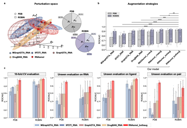 In data perturbation space, RNAsmol effectively reduces the deviation between real negative samples and unknown interaction space through a perturbation strategy. This strategy generates potential "negative" samples by perturbing known negative samples, and at the same time expands the boundaries of known positive and negative samples through data augmentation techniques. This enables the model to better understand the binding rules between RNA and small molecules, especially in the case of unbalanced data, avoiding the model's bias towards known positive and negative samples. Experimental results show that RNAsmol outperforms traditional methods in 10-fold cross validation, with the average AUROC (area under the curve) index improved by about 8%, and the performance improved by about 16% in the evaluation of unseen samples. This advantage proves the effectiveness of this method in sparse data scenarios and further promotes computational research on RNA-small molecule binding prediction.