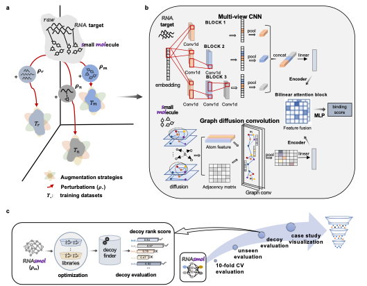 The RNAsmol framework proposed in this work is a deep learning method that combines data perturbation and data augmentation strategies. In this framework, data perturbation simulates the data diversity in the real environment by randomly perturbing the training data, thereby helping the model to better learn the rules of RNA-small molecule binding. Data augmentation increases the model's ability to identify unknown spaces by generating virtual negative samples and potential unlabeled samples based on known interactions. This strategy not only improves the robustness of the model, but also helps it better capture different types of interaction patterns. In addition, the model combines a graph-based molecular feature representation method and a graph diffusion convolution module to model the structure of drug small molecules, and uses a feature fusion module based on an attention mechanism to weightedly integrate target and drug molecule features in multiple modalities, ultimately achieving the scoring prediction between RNA targets and small molecules.