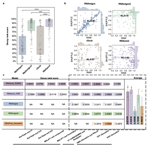 In the application of virtual screening, RNAsmol shows unique advantages. Unlike traditional screening methods that rely on structural information, RNAsmol makes predictions based entirely on RNA sequence information. Because the three-dimensional structural data of many disease-related RNA targets (such as lncRNA) are often difficult to obtain, RNAsmol can fill this data gap to achieve predictive screening of these targets. Experimental results show that RNAsmol successfully improved the ranking score by about 30% when distinguishing between bait molecules and real ligands. Therefore, RNAsmol has a wide range of applicability in various RNA-targeted drug screening, and this method can be used to screen potential drug molecules more efficiently.