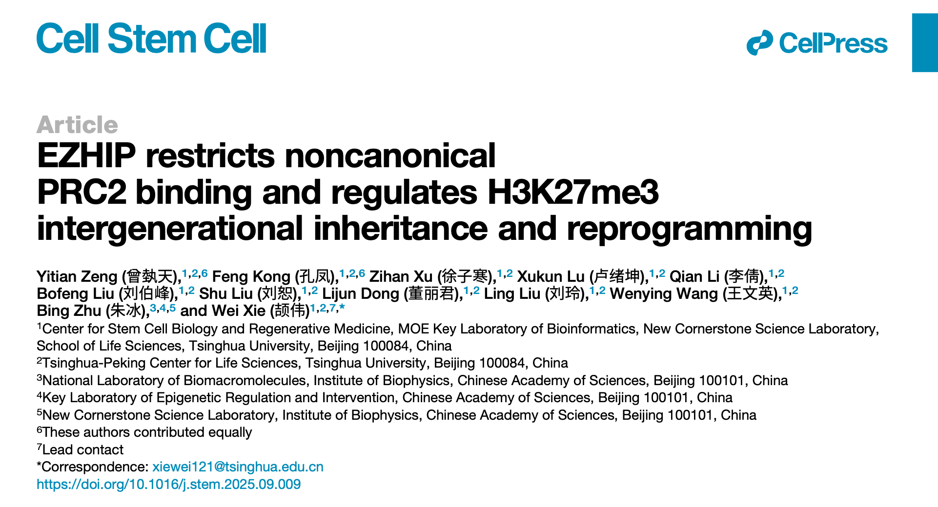 On October 20, 2025, the research group led by Prof. Wei Xie from the School of Life Sciences at Tsinghua University published a research paper entitled "EZHIP restricts noncanonical PRC2 binding and regulates H3K27me3 intergenerational inheritance and reprogramming" in Cell Stem Cell. This study identified EZHIP (EZH inhibitory protein) as a key epigenetic reprogramming factor in mouse early embryos. It controls multi-layer H3K27me3 intergenerational reprogramming, including genome-wide H3K27me3 erasure and re-establishment, as well as the transmission of noncanonical imprinting memory.