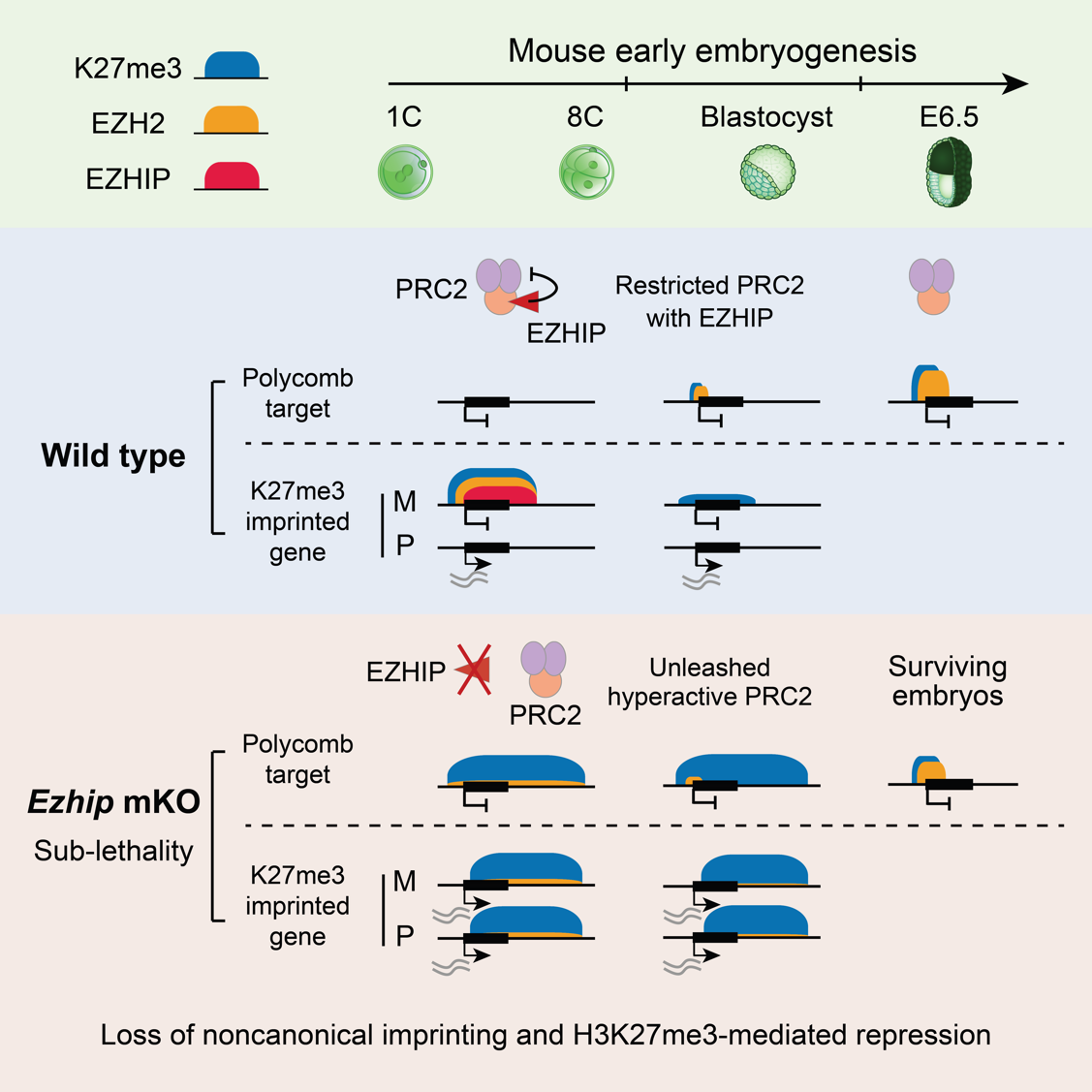 The research team further demonstrated that EZHIP regulates PRC2 noncanonical chromatin binding and H3K27me3 intergenerational reprogramming in early embryos. EZHIP is an endogenous PRC2 inhibitor, specifically expressed in germ cells but silenced by DNA methylation in other cell types [3]. Interestingly, the authors found that Ezhip mRNA accumulates substantially in oocytes but is translationally repressed. Ezhip is actively translated only around two days post-fertilization, resulting in highly abundant EZHIP protein in preimplantation embryos. In wild-type mouse embryos, global demethylation of H3K27me3 occurs before implantation, whereas in EZHIP deficient embryos, this demethylation process is impeded, and H3K27me3 levels rise rapidly. More intriguingly, while the parental asymmetry of H3K27me3 is maintained until the blastocyst stage in wild-type embryos and mediates non-canonical imprinting memory, this asymmetry is completely lost by the two-cell stage in EZHIP deficient embryos, leading to the loss of noncanonical genomic imprinting. Further mechanistic studies revealed that in preimplantation embryos, EZHIP co-binds with PRC2 in noncanonical H3K27me3 domains, forming an H3K27me3-PRC2-EZHIP complex on chromatin, thereby restricting PRC2 enzymatic activity and spreading [4]. Upon EZHIP loss, PRC2 is no longer restricted and subsequently catalyzes H3K27me3 across the majority of the genome, masking almost all parental H3K27me3 memory. Paradoxically, this widespread H3K27me3 deposition does not cause global gene silencing, but instead results in H3K27me3 to lose its repressive function, leading to aberrant activation of noncanonical imprinted genes and defective imprinted X-chromosome inactivation. The authors hypothesized that this might be because H3K27me3 effectors (such as PRC1 and PRC2) are diluted by the massively increased H3K27me3, preventing their concentration on correct target gene regions, thus failing to mediate gene repression. Furthermore, the excessive accumulation of H3K27me3 caused by EZHIP deficiency also impedes the subsequent re-establishment of H3K27me3 at canonical Polycomb target regions and is associated with partial lethality post-implantation.